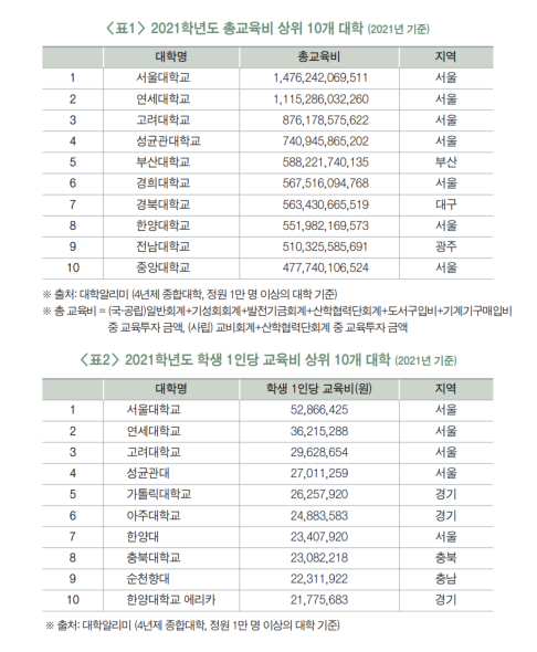 학부모는 먼저 ‘대학의 총교육비’를 살펴보았다. 총교육비는 교육의 양적 인프라를 구축하는데 중요 작용을 하기 때문이다. 그 결과, 교육투자가 높은 대학들은 대부분 수도권에 분포하고 있음을 발견하였다. 나아가 학생들에게 실질적으로 투입되는 ‘1인당 교육비’를 살펴보았는데, 역시 소위 SKY를 필두로 한 수도권 대학들이 월등히 높게 투자하고 있었다.